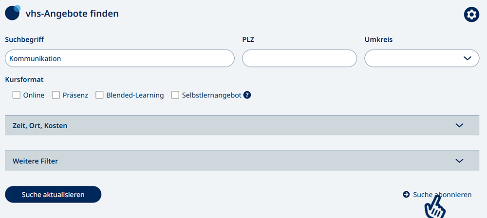Du suchst regelmäßig nach einem bestimmten vhs-Angebot, z. B. einer Fremdsprache in deiner Nähe? Dann kannst du deine individualisierte Suche auch speichern und immer wieder leicht abfragen. Gib deine Suchkriterien ein und klicke dann einfach auf „Suche abonnieren“.