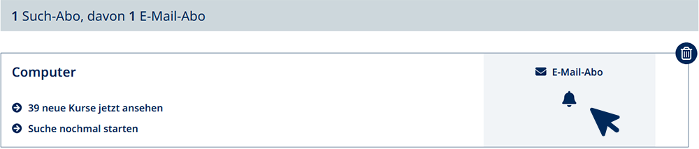 Du findest all deine gespeicherten Suchen auf “Mein vhs-cockpit" oder auch im Menü unter dem Punkt „Meine Such-Abos“. Hier kannst du einstellen, ob und wie oft du per E-Mail über neue Suchergebnisse informiert werden möchtest.